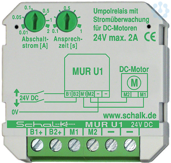 Motor-Umpolrelais , Immer häufiger finden Kleinstantriebe ihre Verwendung in der Gebäudeautomation. Solche sehr kompakten Antriebssysteme arbeiten in der Regel mit DC-Motoren und können daher nicht an den herkömmlichen, für AC-Motoren ausgelegten Steuerungen betrieben werden. Das MUR U1 übernimmt die erforderliche Umsetzung von AC-Steuerung auf DC Antrieb., Eine Umpol-Logik dient zur Laufrichtungsumkehr, und ein einstellbarer Abschaltstrom sorgt in Verbindung mit der einstellbaren Ansprechzeit für eine exakt justierbare und sichere Endabschaltung. , Maße: 43x43x33mm, 24V DC, 10mA-2A