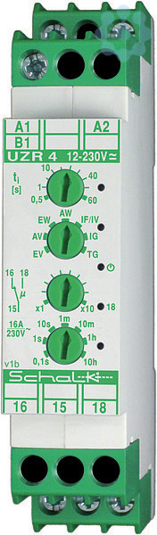 Mit dem Multifunktions-Zeitrelais UZR 4 können folgende Zeitfunktionen realisiert werden: Einschaltverzögerung, Ausschaltverzögerung, Einschaltwischer, Ausschaltwischer, Impulsverzögerung, Impulsformer, Impulsgeber, Taktgeber. Exakte und stufenlose Zeiteinstellung von 0,1s bis 100h möglich. Durch den großen Versorgungsspannungsbereich von 12 bis 230V UC und den potentialfreien Relaiskontakt (Wechsler, 16A) ist das UZR 4 universell einsetzbar. Kann meist als Nachfolger der Typen UZR 3, UZR 3T und UZR 3I eingesetzt werden (Datenblatt beachten, da Funktionsunterschiede). Maße: 18x55mm, 12-230V UC