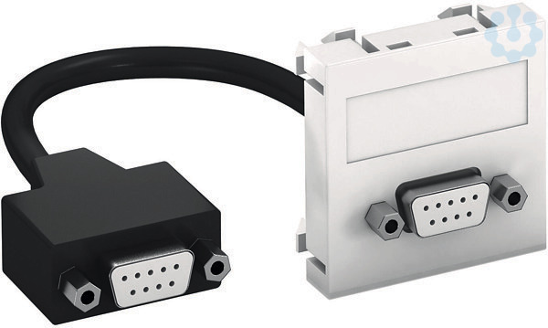 Multimediaträger mit einer D-Sub9-Anschlussbuchse, Kabelauslass gerade, mit Beschriftungsfeld, kurzes D-Sub9-Anschlusskabel (RS232) in Ausführung Buchse-Buchse. Träger mit Rastbefestigung, geeignet für den waagerechten und senkrechten Einbau in die Systemumgebung.