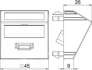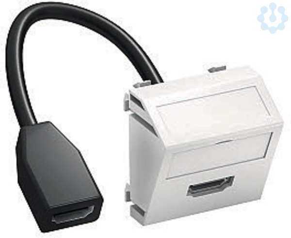 Multimediaträger mit einer HDMI-Anschlussbuchse, Kabelauslass schräg, mit Beschriftungsfeld, kurzes HDMI-Anschlusskabel in Ausführung Buchse-Buchse. Trägerplatte mit Rastbefestigung, geeignet für den waagerechten und senkrechten Einbau in die Systemumgebung.