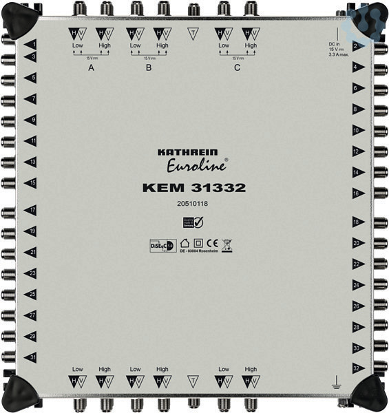Multischalter Durchgang 13 auf 32,13 Durchschleif- 32 Schaltausgaenge, F-Anschluesse, kaskadierbar, DiSEqC-Steuerung, externes Netzteil erforderlich