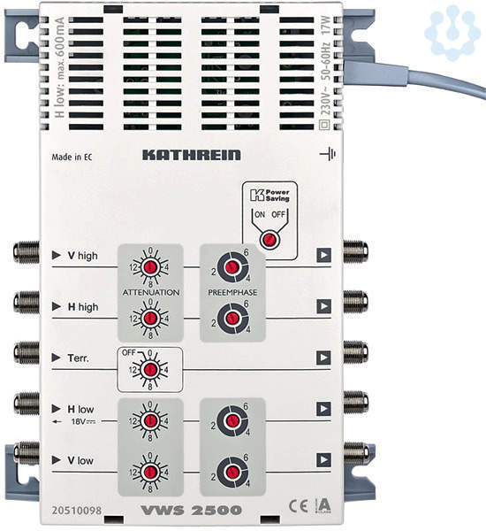 Multischalter-Verteilnetzverstaerker, 47-862 u. 4 x 950-2150 MHz, 5 Eingaenge 5 Ausgaenge, komplett mit Netzteil, Stromr. fuer LNB-Versorgung typ. 600 mA, KPS