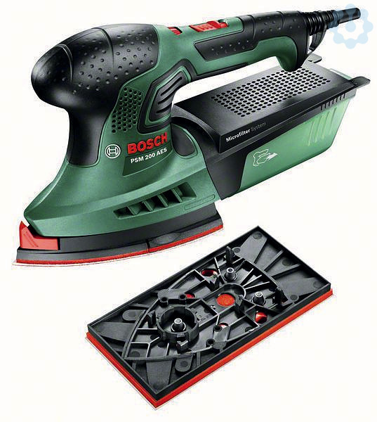 Multischleifer PSM 200 AES, Leistungsstarker Multischleifer mit Schleifplattenoptionen und Drehzahlregelung, Umfasst drei- und viereckige Schleifplatte für die Bewältigung verschiedenster Projekte, Einfacher und schneller Schleifvorsatzwechsel durch SDS-System, Elektronische Drehzahlvorwahl sorgt für die perfekte Drehzahl passend zu Arbeit und Material, Ideal zum Schleifen mittelgroßer und größerer flacher Oberflächen sowie von Ecken und Kanten, Für die Bearbeitung von Oberflächen aus Holz oder Metall sowie gestrichener und lasierter Oberflächen, Rechteckige Schleifplatte (2 609 256 D19), 1 Schleifpapier (bügeleisenform) K 80, 1 Schleifpapier (rechteckig) K 80, Kunststoffkoffer