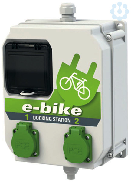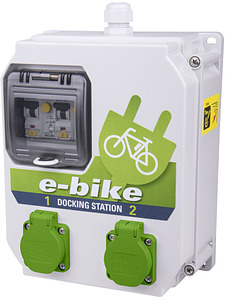 Kunstst.-Wandverteiler Modell MURAU IP54; inkl. Label (e-bike DOCKINGSTATION); 1xM20 Verschraubung oben (Kabeldurchm. 10-14mm PG16) grau; 1xM20 Verschraubung mit Blindstopfen grau unten; 2xSK-Steckdose 16A 250V IP54 (grün) abgesichert ü. 2xFI/LS 6A 1p+N 30mA C TYP A; FI LS Fabrikat Eaton ÖVE / VDE; Verteiler auf Vario-Connector 3polig 10qmm verdrahtet