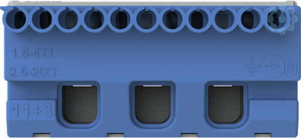 N Quick-Steckklemme für Quick-Steckträger, werkzeuglose Montage durch einfache Steck- und Rasttechnik, klare Farbcodierung: N = blau, flexibles Klemmensystem für mehrere N-Stromkreise, Anzahl der Klemmen: 11 x 1,5 - 4 mm² (Federklemmtechnik) + 3 x 2,5 bis 25 mm² (Schraubanschlusstechnik), Außenmaße H x B x T in mm: 32 x 65 x 31, einfaches Beschriften der Klemmenstellen (DIN VDE 0603 Teil 1) mit vorgedruckten, selbstklebenden Zahlenstreifen.