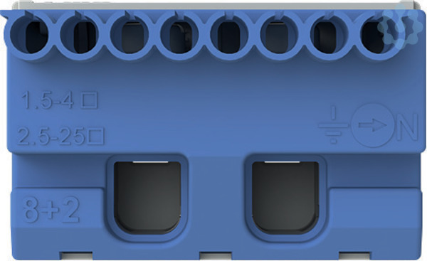 N Quick-Steckklemme für Quick-Steckträger, werkzeuglose Montage durch einfache Steck- und Rasttechnik, klare Farbcodierung: N = blau, flexibles Klemmensystem für mehrere N-Stromkreise, Anzahl der Klemmen: 8 x 1,5 - 4 mm² (Federklemmtechnik) + 2 x 2,5 bis 25 mm² (Schraubanschlusstechnik), Außenmaße H x B x T in mm: 32 x 49 x 31, einfaches Beschriften der Klemmenstellen (DIN VDE 0603 Teil 1) mit vorgedruckten, selbstklebenden Zahlenstreifen.