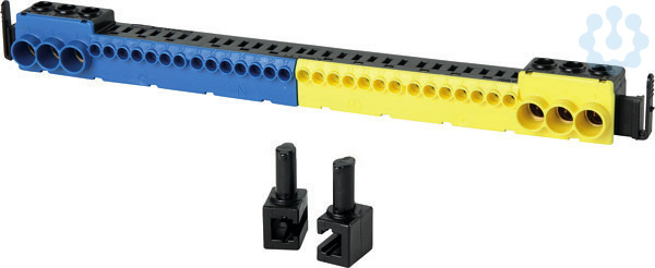Steckkemme ZSSKN17PE, je 3x schraubbar bis 25mm², je 14x steckbar bis 4mm². Farbe blau/gelb.