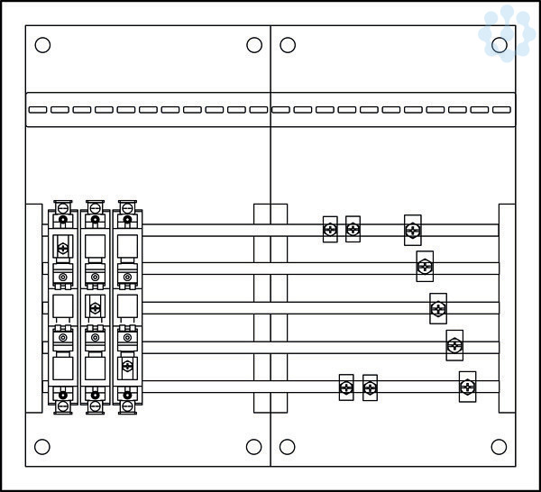 Sammelschienensystem 5-polig, 250 A; 1 x NH00-Tandem-Element; Zu- und Abgänge bis 70mm²; Kabelabfangschiene; Schutzart IP31/43; Hauben plombierbar; Gehäuse 2-feldrig, 3-reihig, 72 Module; Gehäuse: 500mm x 550mm x 165mm