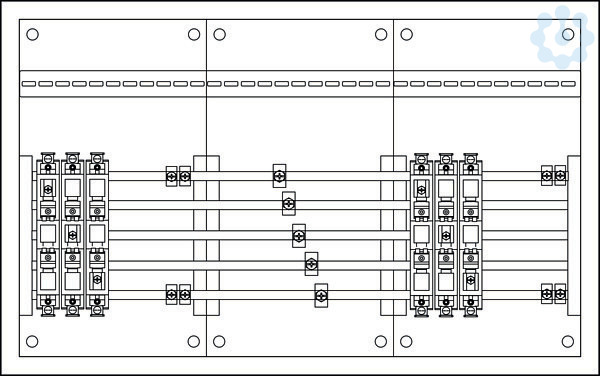 Sammelschienensystem 5-polig, 250 A; 2 x NH00-Tandem-Element; Zu- und Abgänge bis 70mm²; Kabelabfangschiene; Schutzart IP31/43; Hauben plombierbar; Gehäuse 3-feldrig, 3-reihig, 108 Module; Gehäuse: 500mm x 800mm x 165mm