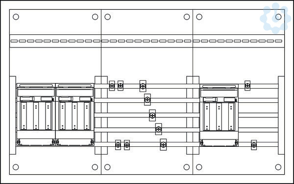 Sammelschienensystem 5-polig, 250 A; 3 x NH00-Trenner; Zu- und Abgänge bis 70mm²; Kabelabfangschiene; Schutzart IP31/43; Hauben plombierbar; Gehäuse 3-feldrig, 3-reihig, 108 Module; Gehäuse: 500mm x 800mm x 165mm