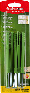 Der fischer Nageldübel N Green mit Senkkopf besteht aus einer Dübelhülse aus Kunststoff und einer galvanisch verzinkten Nagelschraube. Diese sind für eine schnelle Montage bereits vormontiert. Das Granulat zur Herstellung des fischer Nageldübels N Green wird mindestens zur Hälfte aus nachwachsenden Rohstoffen gewonnen. Diese stehen nicht in Konkurrenz zu Anbauflächen für Nahrungs- und Futtermittel. Der Nageldübel N Green verfügt über die gleichen Leistungsmerkmale und Tragfähigkeit wie das Original. Der Nageldübel wird in der zeitsparenden Durchsteckmontage durch das Anbauteil eingeführt. Beim Einschlagen der Nagelschraube spreizt die Dübelhülse auf und verankert sicher im Baustoff. Der fischer Nageldübel N Green mit Senkkopf ist ideal für die Befestigung von Holzkonstruktionen in allen Baustoffen im Innenbereich.