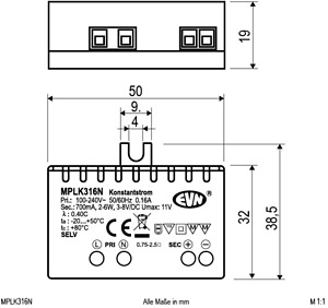 Das LED-Netzgerät lässt sich auf Grund der kleinen Bauform perfekt in Schalterdosen verbauen, kann aber auch beim Möbelbau zum Einsatz gebracht werden, da die MM-Kennzeichnung gegeben ist. Der Anschluss primärseitig und sekundärseitig erfolgt durch Schraubklemmen, welche für Kabel von 0,75mm² - 2,5mm² geeignet sind. Technische Daten: Versorgungsspannung: 100-240V/AC und 180-250V/DC, ta: -20°C - 50°C, tc: 80°C, Powerfaktor 0,40.