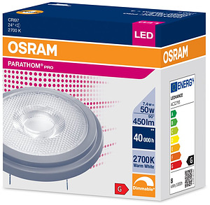 Niedervolt-LED-Reflektorlampen AR111 mit Retrofit-Stecksockel. Produkteigenschaften: LED-Alternative zu Niedervolthalogenlampen. Hohe Farbkonsistenz: ≤ 4 SDCM. Dimmbar. Sockel: G53. Excellente Farbwiedergabe (Ra: 97). Lebensdauer: bis zu 40.000 h. Produktvorteile: Einfacher, schneller und sicherer Lampenaustausch ohne Umverdrahtung. Design, Abmessungen, Lichtstrom vergleichbar mit einer Glüh- oder Halogenlampe. Geringer Wartungsaufwand durch lange Lebensdauer. Keine UV- und IR-nahen Anteile im Lichtstrahl. Stufenloses Dimmen. Sehr hohe Dimmerkompatibilität, siehe auch www.ledvance.de/dim. Kompatibel mit vielen handelsüblichen elektronischen Vorschaltgeräten (siehe auch Kompatibilitätsliste). Sofort 100 % Licht, keine Aufwärmzeit. Anwendungsgebiete: Verkaufs- und Ausstellungsräume. Anwendungen im Haushalt. Anwendung im Gewerbe. Akzentbeleuchtung. Einsatz im Außenbereich nur in geeigneten Außenleuchten.