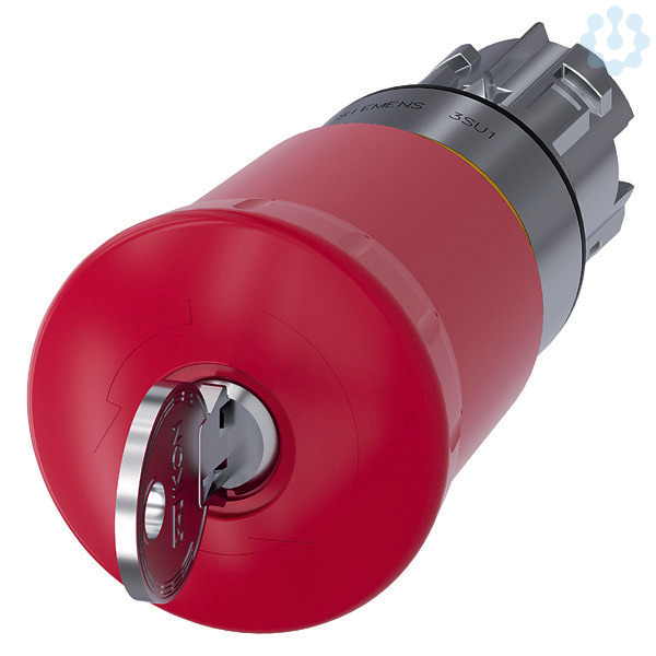 NOT-HALT-Pilzdrucktaster, 22 mm, rund, Metall, hochglanz, rot, 40 mm, mit Schloss IKON, Schließ-Nr. 360012K1, zwangsläufige Verrastung, gemäß DIN EN ISO 13850, Schlossentriegelung NOT-HALT-Pilzdrucktaster SIRIUS ACT nach DIN EN ISO 13850 zur Steuerung von sicherheitsgerichteten Anwendungen mit Überlistsicherheit.Unter dem Markennamen SIRIUS ACT bietet Siemens ein einzigartiges Portfolio an Befehls- und Meldegeräten mit weltweiten Produkt-Zulassungen in vier modernen Designreihen aus robustem Echtmetall und hochwertigem Kunststoff.Das innovative Aufschnappkonzept vereinfacht die Montage so weit, dass dafür nur eine Hand und kein Spezialwerkzeug erforderlich ist. Als Montagebohrungen genügen nutfreie Löcher, da bereits ein 100%iger Verdrehschutz integriert ist.Dank der durchgängig hohen Schutzart sind die robusten Geräte industrietauglich und für den Außeneinsatz geeignet. Sogar die Reinigung mit Hochdruckstrahl ist möglich. Weder Staub, Öle noch aggressive Laugen können den zuverlässigen Betrieb stören.Neben der Standardverdrahtung können die Geräte auch über PROFINET, AS-Interface oder IO-Link an die Steuerung angebunden werden. Damit reduzieren Sie Ihren Verdrahtungsaufwand, minimieren Fehlerquellen und gewinnen mehr Flexibilität.Komfortabel unterstützt der grafische Online-Konfigurator bei Auswahl und Bestellung von Einzelgeräten, Gehäusen und Beschriftungen. Umfangreiche Dokumentation (z.B. Handbuch, 3D-Daten, Anschlussdiagramm) ist verfügbar.Lieferbare Ausführungen: 30/40/60 mm Pilz-Durchmesser, beleuchtet/unbeleuchtet, Zug-/Dreh-/Schlossentriegelung.Hinweis: Einzelgerät, Halter und Module bitte extra bestellen.SIRIUS ACT - Performance in Action beim Befehlen und Melden. Einfach montiert, einfach stark, einfach perfekt.