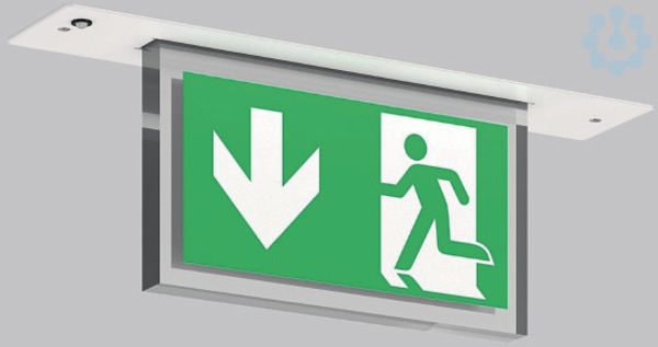 Leuchte zur Rettungswegkennzeichnung. Einbaugehäuse Stahlblech. Deckenplatte Edelstahl glänzend oder pulverbeschichtet. Displayscheibe Kunststoff hochtransparent mit Rettungszeichen einseitig/zweiseitig. Betriebsgeräte integriert. Einzelbatteriesystem mit automatischem Selbsttest und Rückmeldung an die RZB Überwachungssysteme MultiDigit und MWEB. Symbolnummer für Rettungszeichen bei Bestellung angeben!