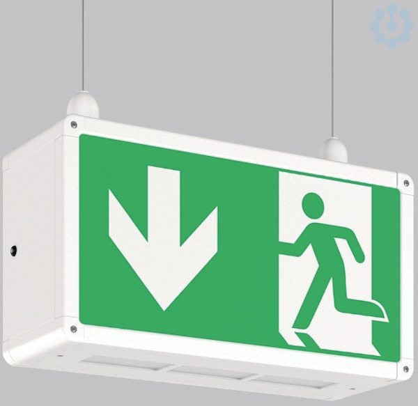 Rechteckige Pendelleuchte im klassischen Design. Zur Rettungswegkennzeichnung. Gehäuse Aluminium mit Eckverbindungen Kunststoff. Kunststoffscheiben opal mit Rettungszeichen einseitig/zweiseitig. Pendelleuchten (Pendel bauseits) für zwei Ketten- oder Seilpendel vorbereitet. Betriebsgeräte integriert. Einzelbatteriesystem mit automatischem Selbsttest.