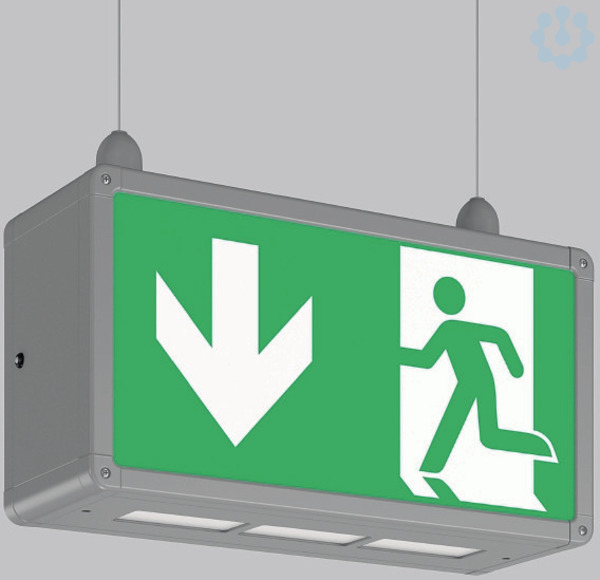 Rechteckige Pendelleuchte im klassischen Design. Zur Rettungswegkennzeichnung. Gehäuse Aluminium mit Eckverbindungen Kunststoff. Kunststoffscheiben opal mit Rettungszeichen einseitig/zweiseitig. Pendelleuchten (Pendel bauseits) für zwei Ketten- oder Seilpendel vorbereitet. Betriebsgeräte integriert. Einzelbatteriesystem mit automatischem Selbsttest.