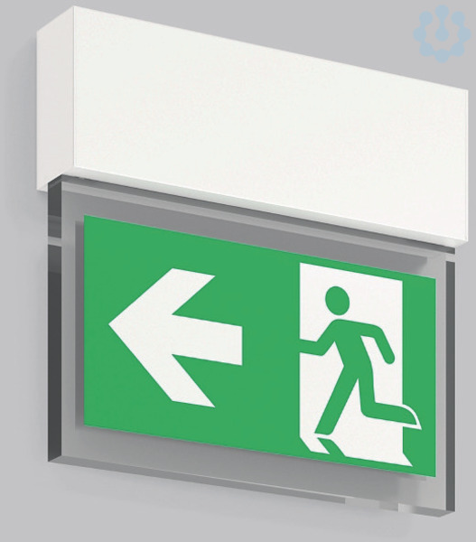 Leuchte zur Rettungswegkennzeichnung. Gehäuse Aluminium-Strangpressprofil eloxiert oder pulverbeschichtet. Displayscheibe Kunststoff hochtransparent mit Rettungszeichen einseitig. Betriebsgerät gleichspannungstauglich, geeignet für zentrale Notstromversorgung.