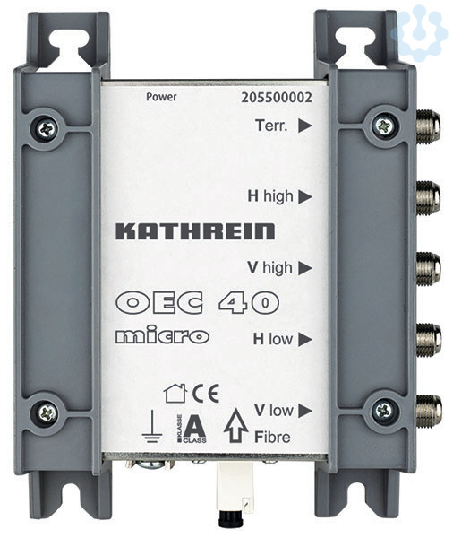 Optischer Empfaenger mit festen Ausgaengen, Opt. Eing. typ. CLIK-Anschl., SAT-ZF Ausg. typ. F-Anschl. Optische Leistung min-max -14 bis -8 dBm