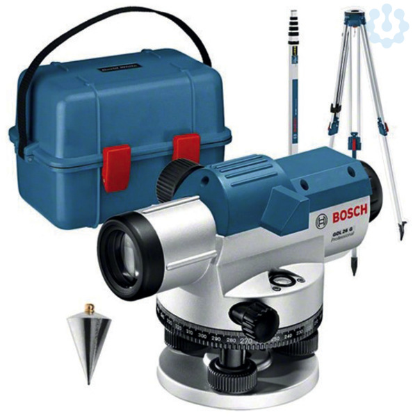 Optisches Nivelliergerät GOL 26 G, Extrem robust im Außenbereich, Ausgelegt für den Einsatz im Außenbereich durch stabiles Metallgehäuse mit Staub- und Spritzwasserschutz (IP 54), Robustes Design mit im Gerät eingebauten Zielkollimator und integrierter Dosenlibelle, Transportkoffer mit Sperrvorrichtung für den Kompensator für einen sicheren Transport, Einstelldorn; Innensechskantschlüssel; Baustativ BT 160 Professional (0 601 091 200); Transportkoffer (1 600 A00 0LF); Messstab GR 500 Professional (0 601 094 300); Linsenschutz; Senklot