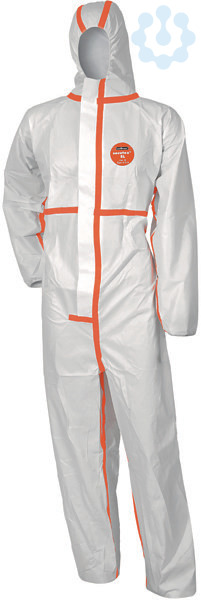 Overall weiß / orange. Einweg-Overall mit angenehm leichtem Tragekomfort, schützt gegen Flüssigkeitsnebel, leichte Flüssigkeitsspritzer und luftgetragene feste Partikel, gute Sichtbarkeit durch deutlich abgesetzte orange Nähte, mit Reißverschluss, Kapuze, Arme und Beine werden durch ein Gummi abgeschlossen, entspricht Kat. III / Typ 4B+5B +6B, antistatisch, Virenschutzprüfung nach EU Norm 14126 . Größe XL