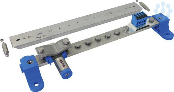 Zündfunkenfreie Ex-Potentialausgleichsschiene zum Einbinden von metallischen Leitern und Leitungen in den Blitzschutz-Potentialausgleich nach VDE 0185-305-3 (IEC 62305-3) sowie den Schutz- und Funktionspotentialausgleich nach DIN VDE 0100 Teil 410/540. Einsatz in Ex-Zonen 1 und 2 (Gase, Dämpfe, Nebel) und Ex-Zonen 21 und 22 (Stäube) Explosionsgruppe IIC (Sicherheitsfaktor 1) nach CLC 50703-2. Entspricht Temperaturklasse T4 sowie DIN EN 62561-1 (VDE 0185-561-1) Blitzstromtragfähigkeitsklasse H (100kA). Schraubensicherung gegen Selbstlockern nach VDE 0185-305-3 Beiblatt 2. Einsatz sowohl im Innenbereich als auch im Außenbereich zulässig. Um Whiskerbildung im Ex-Bereich zu vermeiden, wird der Einsatz von verzinnten Presskabelschuhen mit einer Nickelsperrschicht empfohlen. Das Produkt besitzt folgende Anschlüsse: 1x Flach (M10 x 40 mm mit Federring), 5x Kabelschuh (M10 x 20 mm mit Federring) und 1x Push-in Adapter 4x 4-16mm².