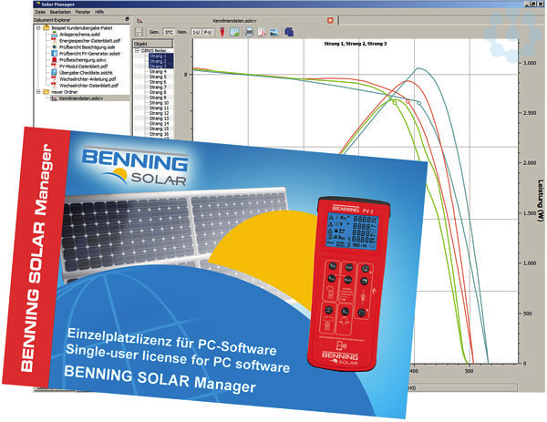 Benning SOLAR Manager PC-Software. Freischaltcode für Einzelplatz-Lizenz. Dokumentation Leistungsbeurteilung Kennlinien I-U P-U über integrierte Moduldatenbank.
