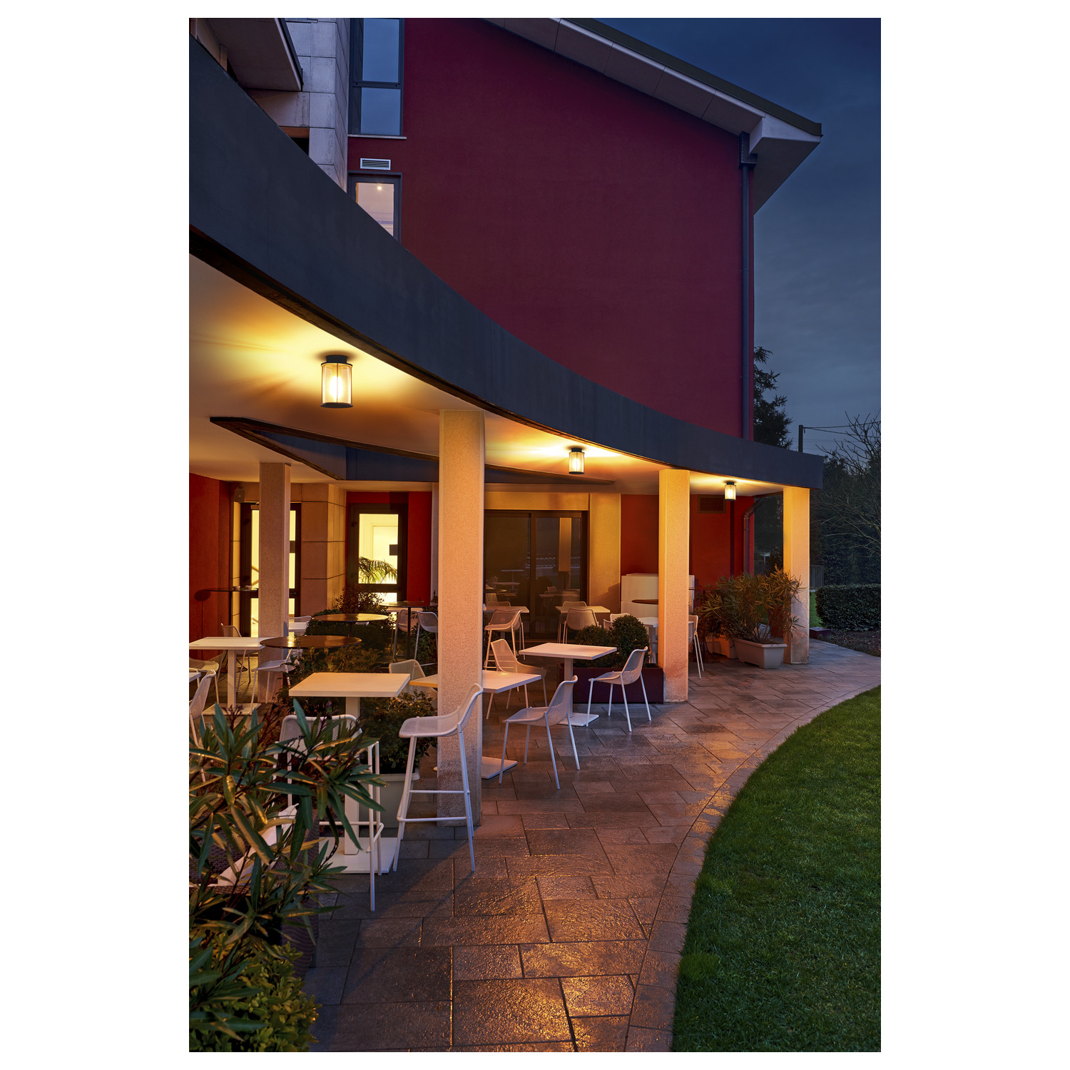 Die Deckenleuchte PHOTONIA besteht aus Aluminium und klarem Glas, welches das Leuchtmittel komplett umschließt. Dank der Position der verbauten Fassungen, erzeugt die montierte Leuchte einen homogenen Lichtkegel. Durch die Schutzart IP44 ist sie für den Außenbereich geeignet. Der elektrische Anschluss erfolgt an 230V Netzspannung.