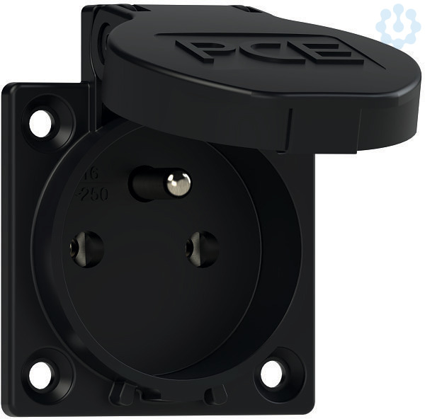 Schutzkontakt-Anbausteckdose Serie P-NOVA plus; Gehäusematerial: PA6, Farbe: schwarz; Flanschabmessungen: 50x50 mm; Anschluss: Schraubklemme, Kabeleinführung: rückwärtig; System: belg./franz. (Schutzkontaktstift); Kontakte: vernickelte Kontakte; 250V / 16A / 2P+E , Schutzart: IP54