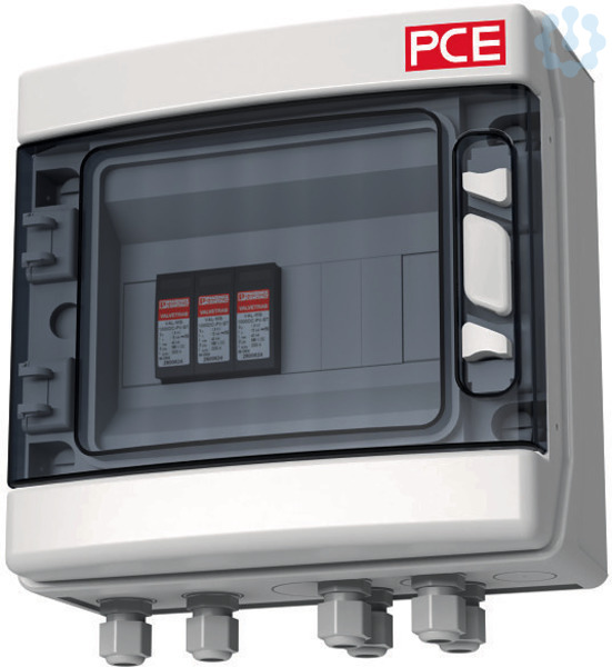 Systemlösung Typ 1+2 für PV-Anlagen mit 1 MPP-Tracker, 1000V DC; Kunststoffgehäuse (238x231x118mm) mit transparentem Fenster für max. 8 Teilungseinheiten; Anzahl MPP-Tracker: 1 / Anzahl Strings pro MPP: 1; 1x Blitzstrom-/Überspannungsableiter Typ 1+2 (PC); 4x Kabelverschraubung M16; 2x Kabelverschraubungen M16 für Schutzleiteranschluss; Schutzart: IP65