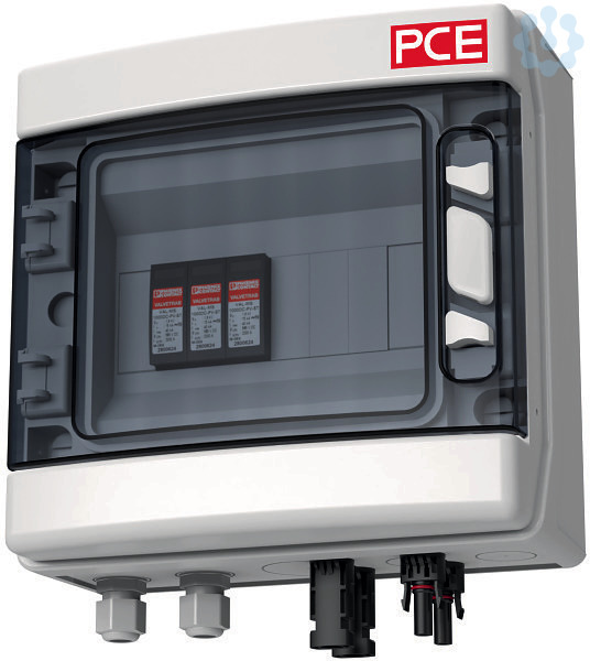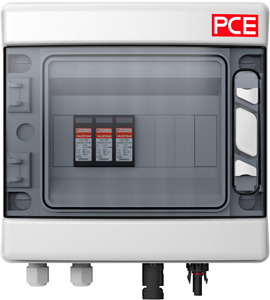 Systemlösung Typ 2 für PV-Anlagen mit 1 MPP-Tracker, 1000V DC; Kunststoffgehäuse (238x231x118mm) mit transparentem Fenster für max. 8 Teilungseinheiten; Anzahl MPP-Tracker: 1 / Anzahl Strings pro MPP: 1; 1x Überspannungsableiter Typ 2 (PC); 4x PV-Steckverbinder; 2x Kabelverschraubungen M16 für Schutzleiteranschluss; fertig verdrahtet; Schutzart: IP65