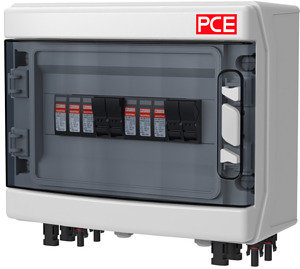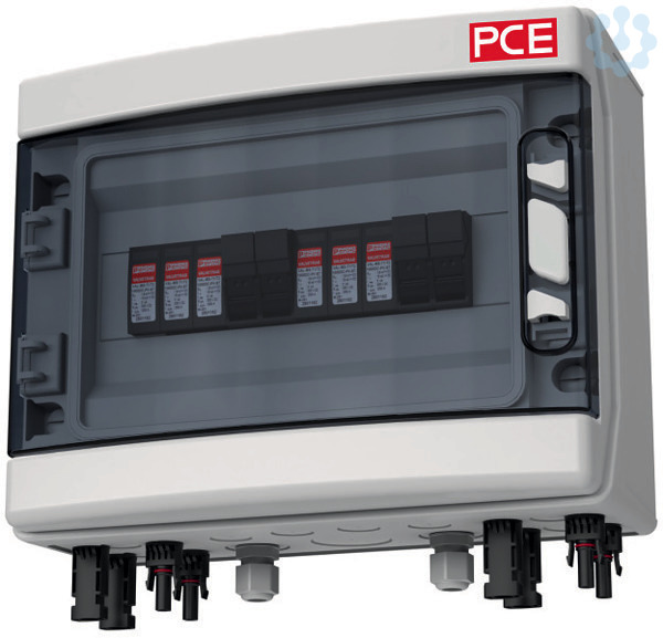 Systemlösung Typ 1+2 für PV-Anlagen mit 2 MPP-Tracker, 1000V DC; Kunststoffgehäuse (310x246x148mm) mit transparentem Fenster für max. 12 Teilungseinheiten; Anzahl MPP-Tracker: 2 / Anzahl Strings pro MPP: 1; 2x Blitzstrom-/Überspannungsableiter Typ 1+2 (PC); 8x PV-Steckverbinder; 4x Sicherungseinsatz 16A gPV 1000V DC (PC); 2x Kabelverschraubungen M16 für Schutzleiteranschluss; fertig verdrahtet; Schutzart: IP65