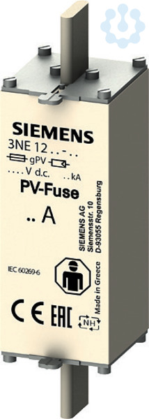 PV-Sicherungseinsatz, mit Messerkontakten, NH1XL, In: 125 A, gPV, Un DC: 1500 V, Stirnkennmelder Halbleiterschutzsicherungen SITOR 3NE, 3NC schützen Leistungshalbleiter vor den Auswirkungen eines Kurzschlusses. Das SITOR-Sicherungssystem von Siemens als wichtiger Bestandteil der SENTRON Schutzkomponenten für die Elektroinstallation bietet effektiven Personen-, Geräte- und Anlagenschutz durch sicheres Abschalten im Überlast- und Kurzschlussfall. Der Einsatzbereich umfasst zusätzlich Frequenzumrichter mit Sicherungen im Eingangs- und im DC-Zwischenkreis sowie auch USV-Anlagen und Sanftstarter für Motoren. Die Siemens SITOR-Sicherungen zeichnen sich vor allem aus durch: 1. Superflinke Abschaltcharakteristik im Vergleich zu herkömmlichen NH-Sicherungen. 2. Auch Leistungshalbleiter werden bei Kurzschluss sicher geschützt. 3. Der Siemens Qualitätsstandard sichert eine sehr gute Kennlinientreue. 4. SITOR-Zylindersicherungen sind nach IEC und UL und größtenteils auch CCC zugelassen und damit weltweit einsetzbar. 5. Teilweise geeignet für den Einbau in NH-Sicherungsunterteile, in NH-Sicherungslasttrennschalter und Lasttrennschalter mit Sicherungen.