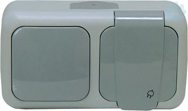 Kombination Schutzkontakt-Steckdose mit Wippschalter Aus, Farbe grau, für waagrechte Montage, Steckanschluss bis 2,5qmm, 2P + E, Nennspannung 250 V, Nennstrom 16A, Nennstrom 10A, Schutzart IP44