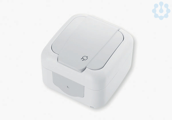 Schutzkontakt Steckdose, Farbe weiß, mit Klappdeckel Steckanschluss bis 2,5qmm, 2P + E, Nennspannung 250V, Nennstrom 16A, Schutzart IP44