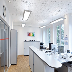 Besonders flach gestaltetes Leuchtengehäuse, Aluminiumstrangpressprofil natur eloxiert, sichtbare Bauhöhe 30mm, Stirnseiten und Seitenteile aus natur eloxiertem Aluminium mit durchlaufender Längsnut, zur Leuchtenunterseite hin abgerundet. Lichtverteilung direkt/indirekt strahlend, Direktanteil mittels Microprismenscheibe aus PMMA, homogener Lichtsaustritt durch seitliche LED-Lichteinkopplung sowie aufliegendem Aluminium-Reflektor in hochreflektierend weißer Beschichtung, mit Micro-Lochung für den Indirektlichtanteil, für Bildschirmarbeitsplätze, rundumentblendet nach aktueller Norm DIN-EN 12464-1. LED Treiber Design integriert. Variante LC01: ,Variante Masterleuchte LC01 mit eingebautem Steuergerät und Sensor zum tageslicht- und präsenzabhängigen Regeln von bis zu 31 Slaveleuchten DALI, anschlussfertig verdrahtet über 7-polige Anschlussklemme in Steckkontakt-Technik. Funktionen: Lichtsteuerung mit App-Anbindung über Bluetooth, Kostenlose App für IOS und Android verfügbar im App Store, Ein/Aus, manuelles Dimmen und Sollwerteinstellung mittels Standardtaster, tageslichtabhängige Regelung, Präsenzfunktion. Verwendete Systemkomponenten: Steuergerät LC-OM DALIecoBT, Licht- und Präsenzsensor LC-OM DALI LS/PD LI. Anschluss von bis zu drei weiteren Sensoren möglich. Leuchten mit Sensor, zur Erweiterung des Präsenzbereichs, auf Anfrage. Beschreibung siehe Kapitel Advanced Services.