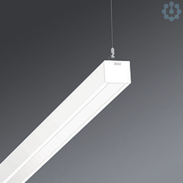 Stahlblechgehäuse im Quadratdesign, vorbereitet zum Befestigen von Stirnseiten oder Leuchtenverbindern aus Stahl, Lichtverteilung direkt / indirekt, Entblendung durch diffus strahlendes, satiniertes PC-Profil, bei Lichtbandmontage Diffusor optisch durchlaufend, Elektrischer Anschluss über 3-polige Anschlussklemme in Steckkontakt-Technik.