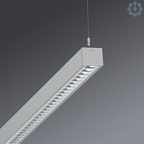 Stahlblechgehäuse im Quadratdesign, vorbereitet zum Befestigen von Stirnseiten oder Leuchtenverbindern aus Stahl, Lichtverteilung direkt / indirekt mittels reflexionsverstärktem Aluminium-Parabolraster mit Reinstsilber-Beschichtung, hochglänzend in Darklight-Spiegeloptik mit Niederquerschnitts-Lamellen, Lichtreflexionsgrad 98 %, für Bildschirmarbeitsplätze, 65° < 1000 cd/qm rundumentblendet nach aktueller Norm DIN-EN 12464-1, selbstrastend, bei Lichtbandmontage Raster optisch durchlaufend, Elektrischer Anschluss über 3-polige Anschlussklemme in Steckkontakt-Technik.