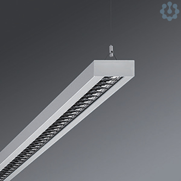 Stahlblechgehäuse, kompakter rechteckiger Querschnitt, Bauhöhe 40mm, vorbereitet zum Befestigen von Stirnseiten oder Leuchtenverbindern aus Stahl, Lichtverteilung direkt / indirekt mittels reflexionsverstärktem Aluminium-Parabolraster mit Reinstsilber-Beschichtung, hochglänzend in Darklight-Spiegeloptik mit Niederquerschnitts-Lamellen, Lichtreflexionsgrad 98 %, für Bildschirmarbeitsplätze, 65° < 1000 cd/qm rundumentblendet nach aktueller Norm DIN-EN 12464-1, selbstrastend, bei Lichtbandmontage Raster optisch durchlaufend, Elektrischer Anschluss über 3-polige Anschlussklemme in Steckkontakt-Technik.