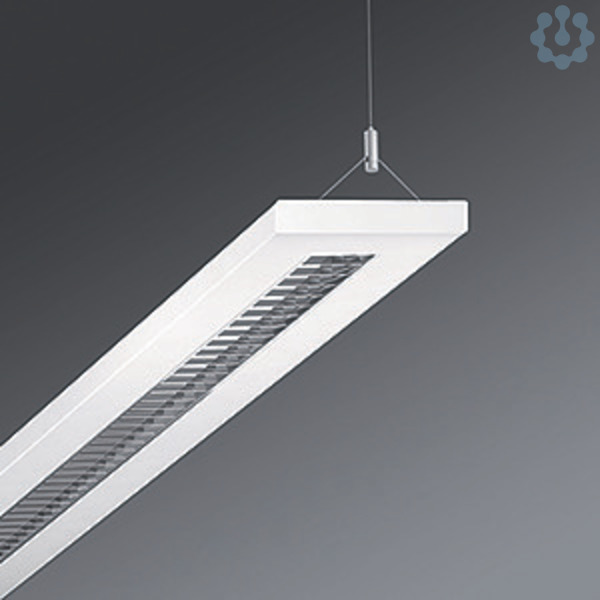 Stahlblechgehäuse, flacher rechteckiger Querschnitt, sichtbare Bauhöhe 26mm, Stirnseiten aus Stahl, Lichtverteilung direkt/indirekt mittels reflexionsverstärktem Aluminium-Parabolraster seidenmatt mit Niederquerschnitts-Lamellen, für Bildschirmarbeitsplätze, 65° < 1000 cd/qm rundumentblendet nach aktueller Norm DIN-EN 12464-1, selbstrastend, Elektrischer Anschluss über integrierte transparente Anschlussleitung 3x0,75mm², Länge 1900mm, Leitungsenden abgemantelt.