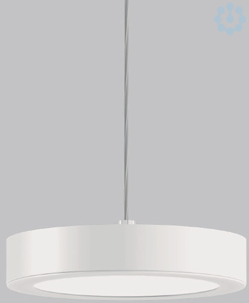 Flache zylindrische Pendelleuchte. Zylindergehäuse Stahlblech pulverbeschichtet. Gehäuse Aluminium-Druckguss und Stahlblech pulverbeschichtet. Abdeckring Aluminium-Druckguss pulverbeschichtet. Baldachin Stahlblech pulverbeschichtet. Diffusor und Lightguide aus vergilbungsfreiem Kunststoff (PMMA) opal matt. Geeignet für Pendel. Transparente Pendelleitung 2 m, kürzbar. Aufnahmeringe zur nachträglichen Montage eines Stoffschirmes als Zubehör erhältlich.