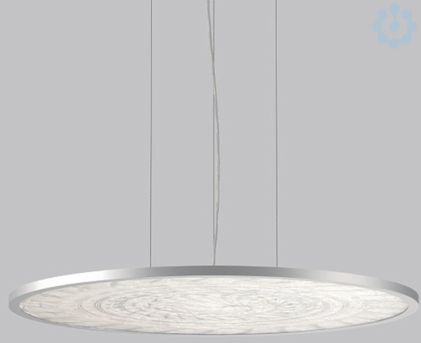 Dekorative runde LED Anbau-Flächenleuchte. Rahmen Aluminium-Strangpressprofil eloxiert. Baldachin Aluminium eloxiert. Diffusor handgefertigtes Glas FerroMurano weiß. Seitliche Lichteinkopplung (RZB SIDELITE®-Technologie) für überdurchschnittlich homogene Leuchtdichteverteilung und randlose Ausleuchtung. 3-Punkt Stahlseilabhängung stufenlos höhenverstellbar oder gewünschte Sonderlängen auf Anfrage. Einfachste Installation durch Plug & Play Stecksystem. Betriebsgerät integriert.