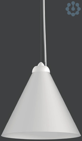 Kegelförmige Pendelleuchte. Armatur Kunststoff weiß. Baldachin Kunststoff weiß. Mundgeblasenes Opalglas seidenmatt. Geeignet für Pendel.
