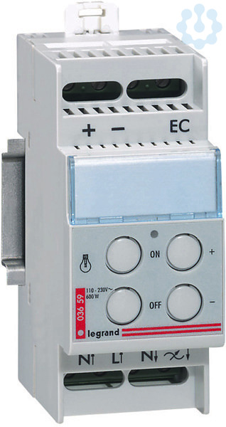 Legrand Pasenanschnittdimmer, Leistung 600 W, Lastart: R,L, 2-modulig, Fernsteuerbar durch Taster, Direktsteuerung am Dimmer durch Tastbedienung, Versorgungsspannung: 230 V 50/60 Hz, für Ein-, Aus- und Helligkeitssteuerung , Befestigung auf Hutprofilschiene EN 60715 durch rastende Schnellbefestigung.