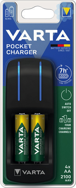 Der VARTA Pocket Charger wird mit 4x AA 2100mAh Akkus geliefert und kann 2/4 AA oder AAA Akkus mit einer weltweiten Spannung von 100-240 V laden. Mit dem Sicherheitstimer und der doppelseitigen Bestückung können Sie Ihren Akku ohne Überladung sicher aufladen. Die blaue LED-Ladeanzeige vervollständigt den kompakten Pocket Charger und macht ihn zu Ihrem zuverlässigen Ladegerät für alle Ihre Akkus.