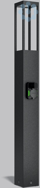 Pollerleuchte mit quadratischem Querschnitt. Ausstattungsvariante SMART. Mit EV-Ladeeinrichtung nach IEC 61851-1 Mode 3. Für den privaten und halböffentlichen Bereich. Standrohr aus korrosionsbeständigem Aluminium, seewasserbeständig pulverbeschichtet. Mit voll umschlossenen Befestigungssockel aus Edelstahl. Mit LED Leuchtenkopf, Lichtcharakteristik geeignet zur Beleuchtung von öffentlichen Wegen nach DIN EN 13201. Anschraubwinkel und Schrauben für EV-Charger Einheit aus Edelstahl. Langlöcher im Sockel zur nachträglichen, einfachen Ausrichtung des Pollers. EV-Charger in integrierter Box, mit zwei Ladesteckdosen Typ 2, mit Verriegelung.
