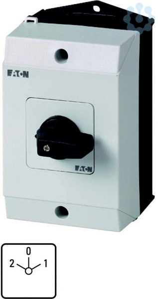 Polumschalter, Sortiment: Steuerschalter, Typkenner: T0, mit schwarzem Knebel und Frontschild, Kontakte: 8, Schutzart: IP65, Bauform: Aufbau, Schaltfunktion: Dahlander-Schaltung, 2 Drehzahlen, Schaltwinkel: 60 °, Schaltverhalten: rastend, mit 0-Stellung, Frontschild: 2-0-1, Bemessungsbetriebsleistung AC-23A, 50 - 60 Hz 400 V: P = 5.5 kW, Bemessungsdauerstrom: Iu = 20 A, 4 Baueinheit(en), Normen und Bestimmungen: IEC/EN 60947, VDE 0660, IEC/EN 60204, Lasttrennschalter nach IEC/EN 60947-3