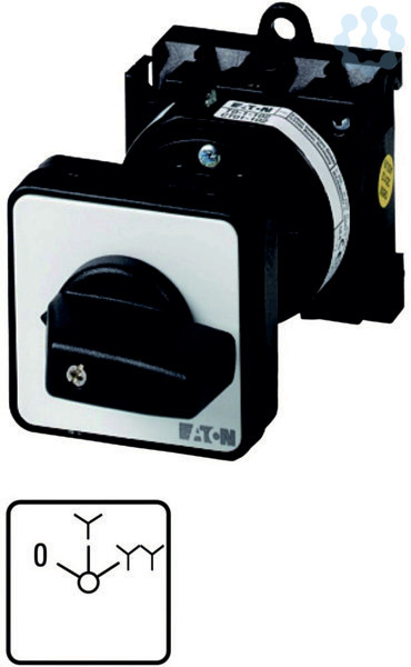 Polumschalter, Sortiment: Steuerschalter, Typkenner: T0, mit schwarzem Knebel und Frontschild, Kontakte: 8, Schutzart: Front IP65, Bauform: Zwischenbau, Schaltfunktion: Dahlander-Schaltung, 2 Drehzahlen, Schaltwinkel: 60 °, Schaltverhalten: rastend, mit 0-Stellung, Frontschild: 0-Y-YY, Bemessungsbetriebsleistung AC-23A, 50 - 60 Hz 400 V: P = 5.5 kW, Bemessungsdauerstrom: Iu = 20 A, 4 Baueinheit(en), Normen und Bestimmungen: IEC/EN 60947, VDE 0660, IEC/EN 60204, CSA, UL, Lasttrennschalter nach IEC/EN 60947-3