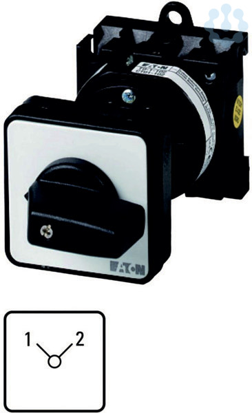 Polumschalter, Sortiment: Steuerschalter, Typkenner: T0, mit schwarzem Knebel und Frontschild, Kontakte: 8, Schutzart: Front IP65, Bauform: Zwischenbau, Schaltfunktion: Dahlander-Schaltung, 2 Drehzahlen, Schaltwinkel: 90 °, Schaltverhalten: rastend, ohne 0-Stellung, Frontschild: 1-2, Bemessungsbetriebsleistung AC-23A, 50 - 60 Hz 400 V: P = 5.5 kW, Bemessungsdauerstrom: Iu = 20 A, 4 Baueinheit(en), Normen und Bestimmungen: IEC/EN 60947, VDE 0660, IEC/EN 60204, CSA, UL, Lasttrennschalter nach IEC/EN 60947-3