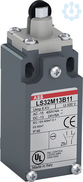 LS35M13B11 ist ein 30 mm breiter Positionsschalter aus einer Zinklegierung (Zamak), mit 2 Befestigungsbohrungen oben,1 1/2 Zoll NPT Kabeleinführung unten, 1 abgeflachten Kunststoff-Rollendruckbolzen sowie 1 Schließer + 1 Öffner als Sprungkontakt